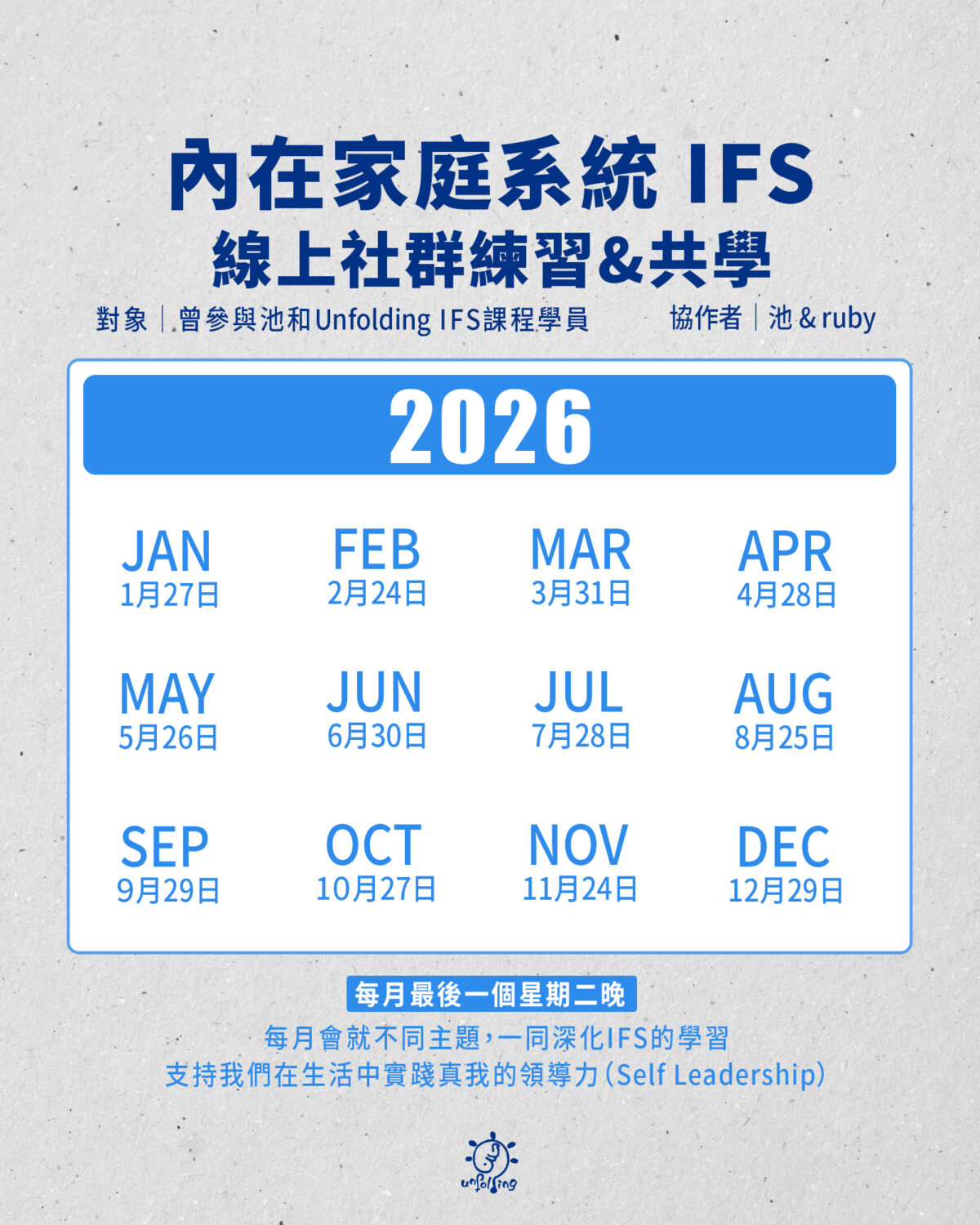 # 如您未有內在家庭系統的學習經驗,我們邀請您來參與 Unfolding 的課程。請加入我們的電郵通訊或Whatsapp公告頻道,留意最新消息。