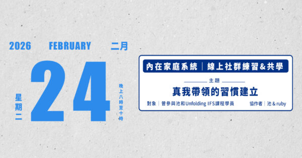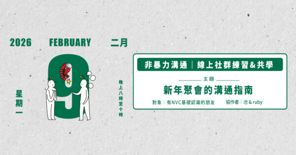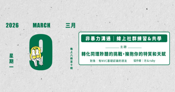 每月一次的練習是我們支持學習者實踐且互相支持的空間,每次由導師帶領學員分組練習。練習不以教學為主,只供已學習過非暴力溝通(NVC)或內在家庭系統(IFS)的朋友參與。